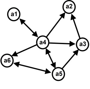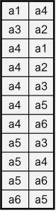 The edgelist format stores only the ties that are present (i.e., with non-zero values). Each non-zero directed tie (edge) is stored in a separate row, where the first column contains the name of the sender and the second column contains the name of the receiver of the tie. In the example below, we can see that there is a tie from a1 to a4, but no tie from a4 to a1 as the dyad (a4, a1) is not present.