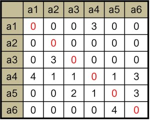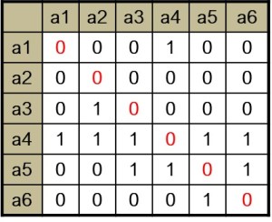 For an undirected network, the matrix will be symmetrical, meaning that the value from, for example, a1 to a3, will be the same as the value from a3 to a1.