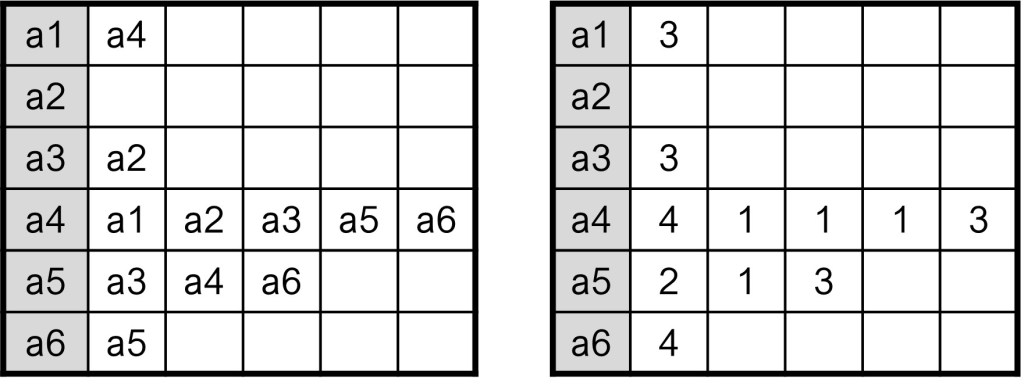 For a network with tie values, as above, two separate files are needed, with one file containing the names of the sender in the first column and the receivers in the subsequent columns and a second file containing again the names in the first column and the values of the ties in the subsequent cells. Note that the values should be in the corresponding cells (for example the 3 in 6th column of row 4 indicates the strength of the tie from a4 to a6).